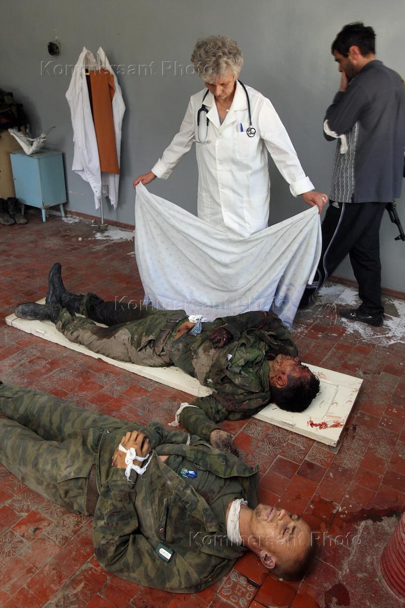 Грузино-югоосетинский конфликт. Оказание первой помощи раненым солдатам в подвале больницы города Цхинвал.