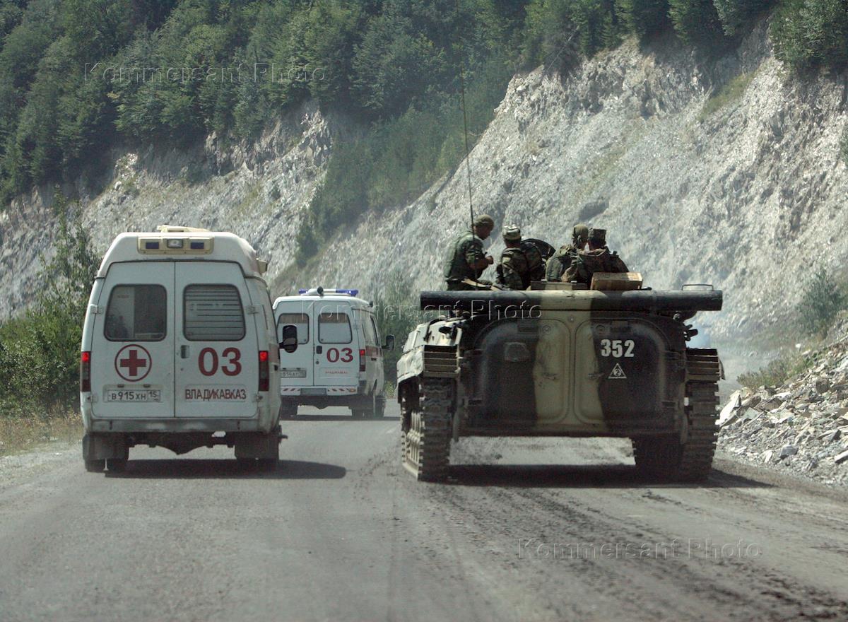 Грузино-югоосетинский конфликт. Колонна военной техники 58 армии России и автомобиль "Скорой помощи" на Транскавказской магистрале.