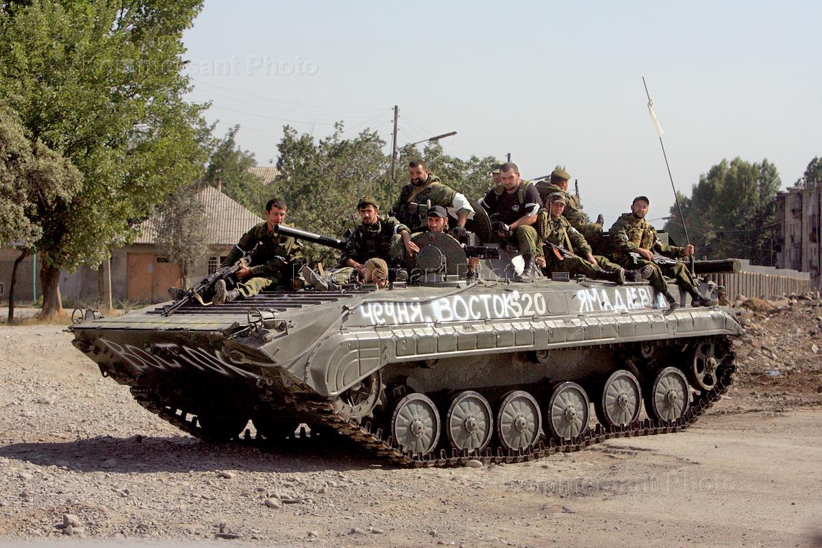 Грузино-югоосетинский вооруженный конфликт. Солдаты батальона "Восток" на бронетранспортере с надписью "Чечня. Восток. Ямадаев" на улицах города Цхинвал.