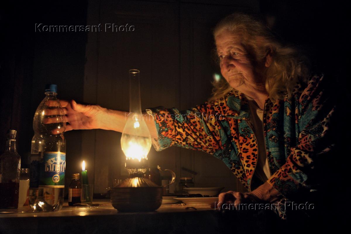 Грузино-югоосетинский вооруженный конфликт. Местная жительница города Цхинвал сидит за столом у керосиновой лампы.