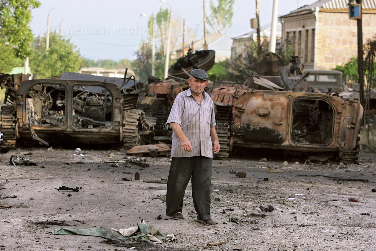 Грузино-югоосетинский вооруженный конфликт. Разбитая грузинская военная техника на улицах города Цхинвал.