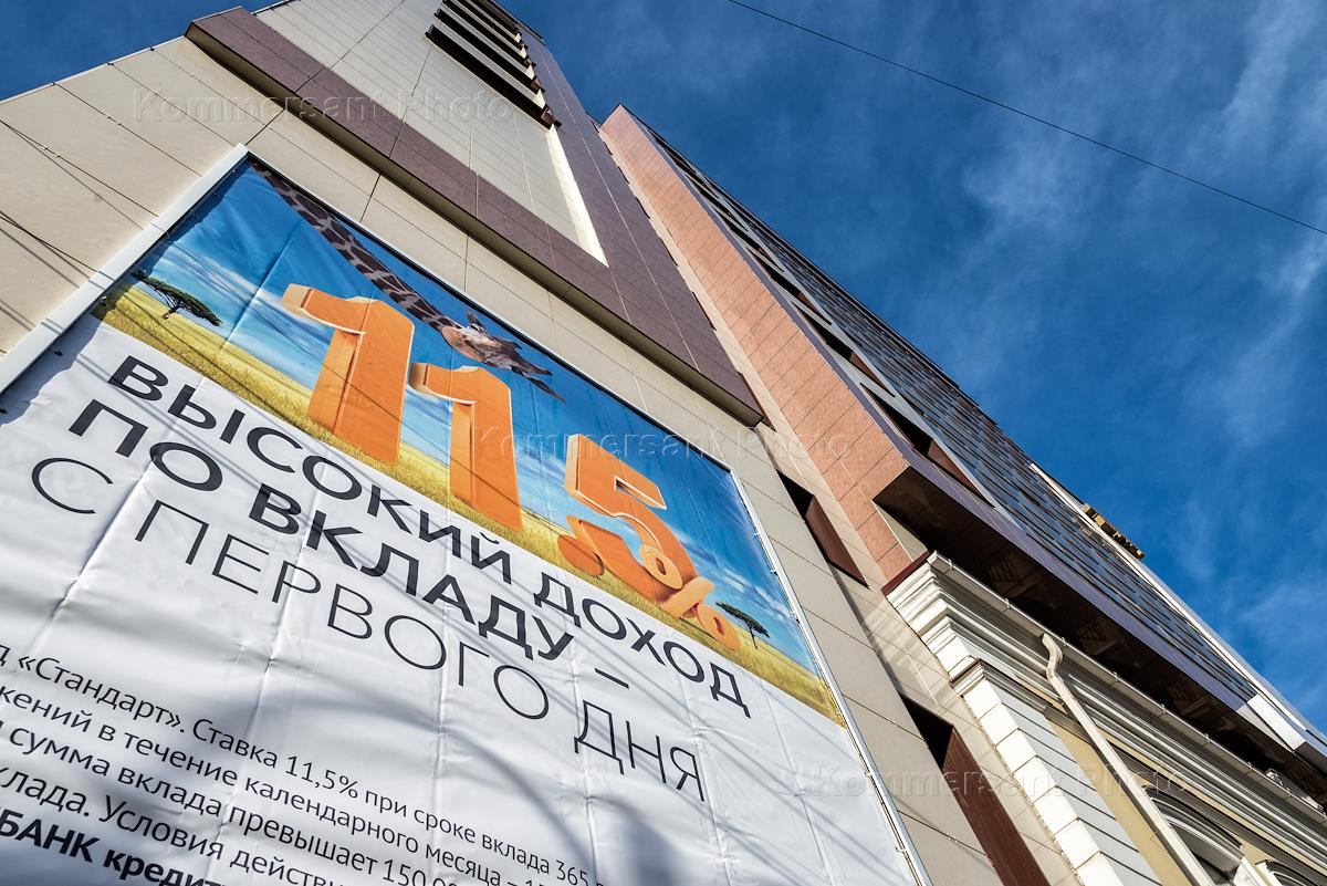 [English translation in progress (2)] Red signal of a traffic light on a background of a building "Роспромбанк" and inscriptions " Credits to legal persons and businessmen, факторинг, leasing ".