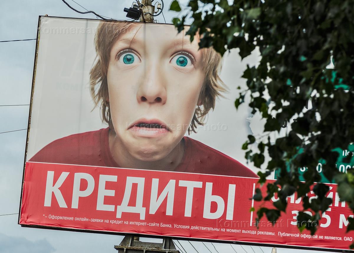 [English translation in progress (2)] Red signal of a traffic light on a background of a building "Роспромбанк" and inscriptions " Credits to legal persons and businessmen, факторинг, leasing ".