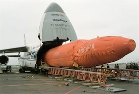 Ракета "Ангара" размещается в грузовом самолете АН 124 для транспортирования на авиасалоне в Ле-Бурже (Франция).