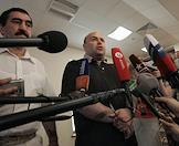 Президент Союза грузин России Михаил Хубутия (справа) и президент Конгресса национальных объединений России Владимир Хомерики (в центре) отвечают на вопросы журналистов после Межнационального консультативного совета по военным действиям в Южной Осетии. Совет прошел в Московском доме национальностей.