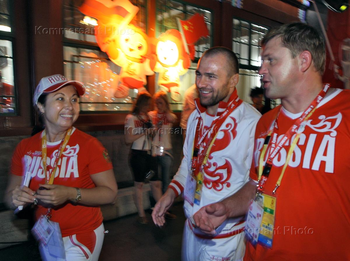 XXIX Летние Олимпийские Игры в Пекине. Член Комитета Государственной Думы России по международным делам, олимпийский чемпион Александр Карелин (слева) во время чествования российских олимпийских чемпионов на вечеринке в "Русском доме".
