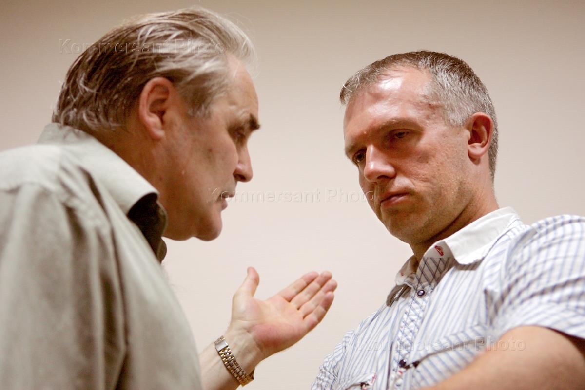 Адвокат Юрий Баграев (слева) и экс-начальник Главного следственного управления Следственного комитета при генпрокуратуре Дмитрий Довгий (справа) на слушаниях по его делу в Басманном суде. Дмитрия Довгия подозревают в получении крупной взятки — 750 тысяч евро.