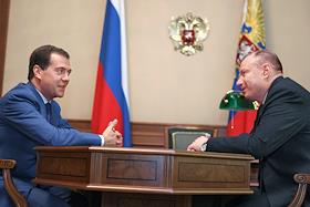 Президент России Дмитрий Медведев (справа) и президент компании "Интеррос" Владимир Потанин (слева) во время встречи в резиденции Президента России "Бочаров ручей".