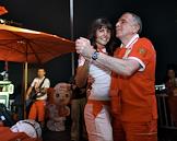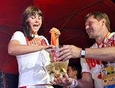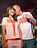 XXIX Летние Олимпийские Игры в Пекине. Российская спортсменка, завоевавшая золотую медаль в марафонном плавании на открытой воде на дистанции 10 км Лариса Ильченко (слева) и руководитель российского Имперского балета Гедиминас Таранда (справа) во время чествования российских олимпийских чемпионов на вечеринке в "Русском доме".