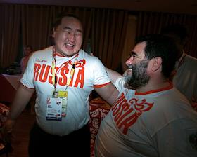 XXIX Летние Олимпийские Игры в Пекине. Сумоист Асашорю Акинори (слева) и глава компании "Боско ди Чильеджи" в России Михаил Куснирович (справа) во время чествования российских олимпийских чемпионов на вечеринке в "Русском Доме".
