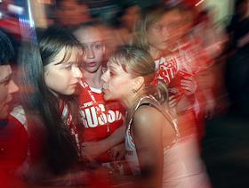XXIX Летние Олимпийские Игры в Пекине. Российские гимнастки Анна Павлова (вторая слева) и Елена Замолодчикова (в центре) во время чествования российских олимпийских чемпионов на вечеринке в "Русском Доме".