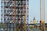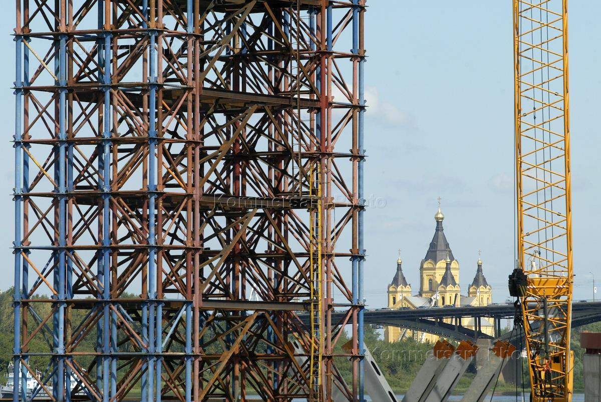 Строительство метромоста через Оку. Решетчатая опалубка и кран с храмом Александра Невского.