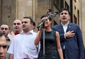 Грузино-югоосетинский вооруженный конфликт. Президент Грузии Михаил Саакашвили (справа) во время акции "Мирная манифестация Грузии". Акция прошла у здания парламента в Тбилиси.