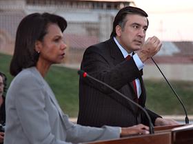 Грузино-югоосетинский вооруженный конфликт. Государственный секретарь США Кондолиза Райс (слева) и президент Грузии Михаил Саакашвили (справа) на совместной пресс-конференции, посвященной подписанию "соглашения о прекращении огня между Грузией и Россией, согласованного президентами Франции и России".