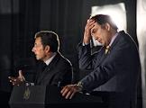 Грузино-югоосетинский вооруженный конфликт. Президент Франции Николя Саркози (слева) и президент Грузии Михаил Саакашвили (справа) во время совместной пресс-конференции.