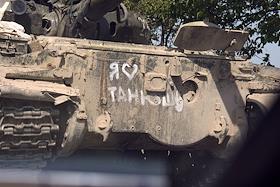 Грузино-югоосетинский вооруженный конфликт. Ситуация в Гори. Надпись на танке "Я люблю Танюшу!".