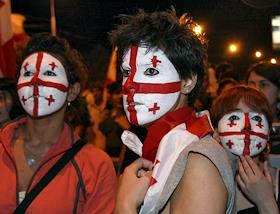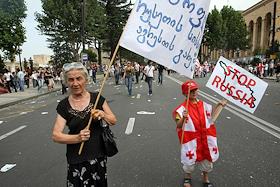 Грузино-югоосетинский вооруженный конфликт. Участинки митинга протеста и шествия к российскому посольству на проспекте Руставели в Тбилиси.