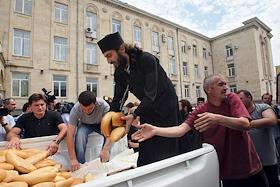 Грузино-югоосетинский вооруженный конфликт. Ситуация в Гори. Раздача гуманитарной помощи от грузинского монастыря.