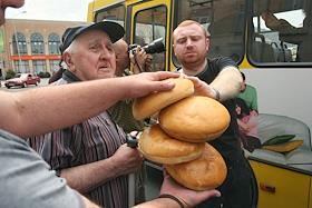 Грузино-югоосетинский вооруженный конфликт. Ситуация в Гори. Раздача гуманитарной помощи от грузинского монастыря на центральной площади города.