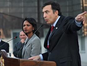Грузино-югоосетинский вооруженный конфликт. Государственный секретарь США Кондолиза Райс (слева) и президент Грузии Михаил Саакашвили (справа) на совместной пресс-конференции, посвященной подписанию "соглашения о прекращении огня между Грузией и Россией, согласованного президентами Франции и России".