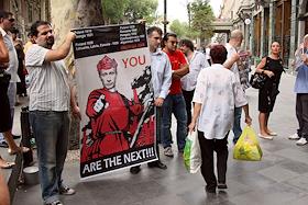 Грузино-югоосетинский вооруженный конфликт. Митинг протеста и шествие к российскому посольству на проспекте Руставели в Тбилиси. Женщина держит плакат "Putin - terrorist".