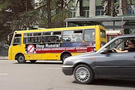 Грузино-югоосетинский вооруженный конфликт. Надпись на рейсовом автобусе "Стоп! Россия!", "Стоп русской агрессии!".