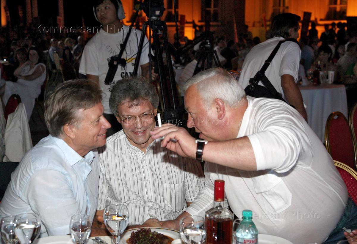 XXIX Летние Олимпийские Игры в Пекине. Управляющий делами Президента России Владимир Кожин (слева), президент Федерации бокса России Евгений Муров (в центре) и певец Олег Газманов (справа) на заключительном приеме от Леонида Тягачева в Доме друзей Олимпиады.