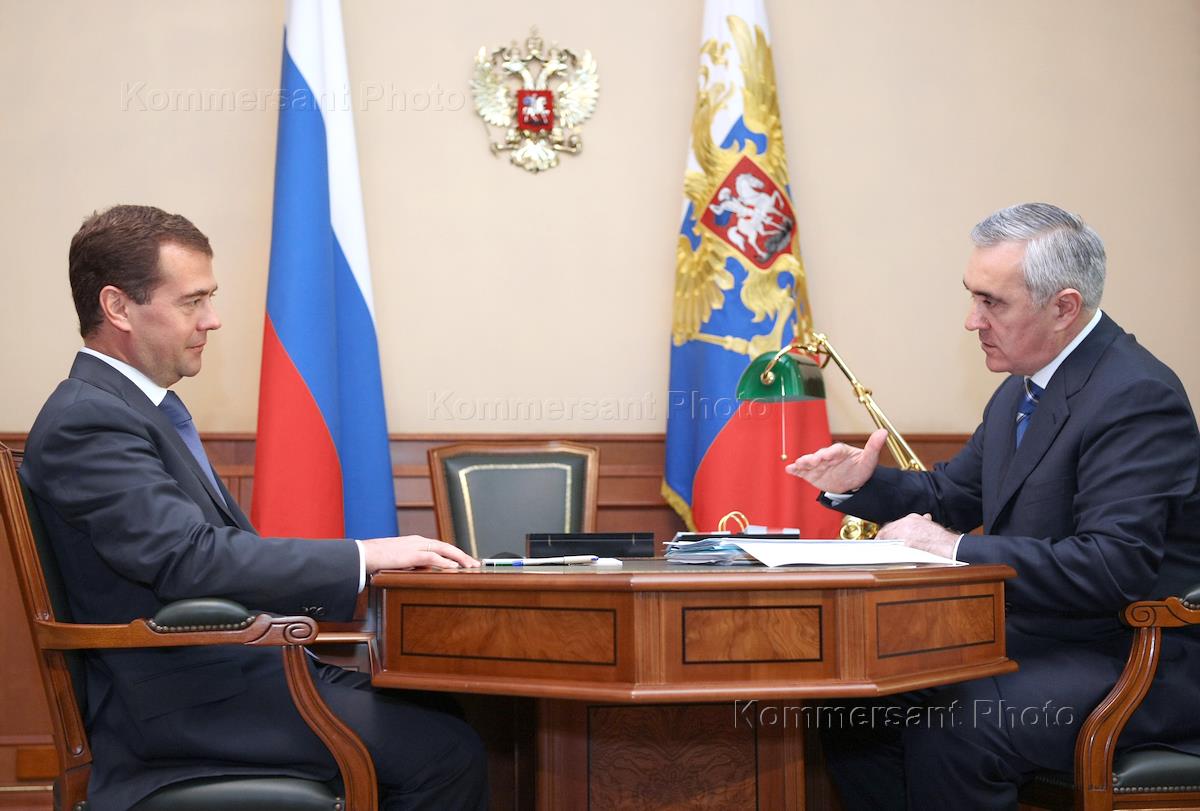 President of Russia Dmitry Medvedev (left) and president of Ingushetia Murat Zyazikov (right) meet at the president of Russia's residence Bocharov Ruchey.