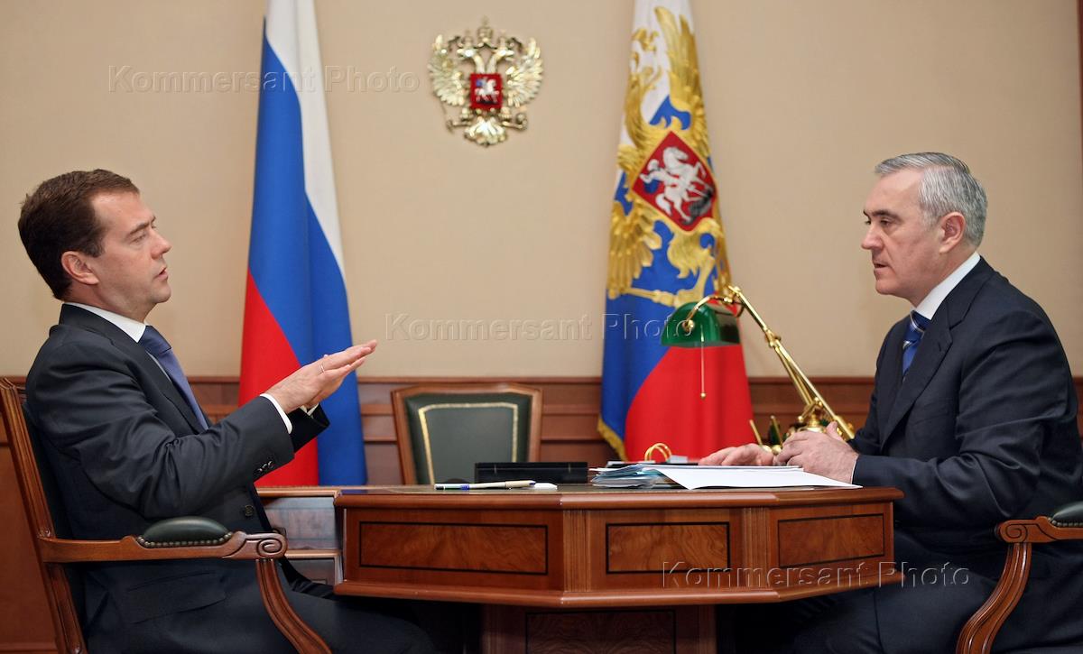 President of Russia Dmitry Medvedev (left) and president of Ingushetia Murat Zyazikov (right) meet at the president of Russia's residence Bocharov Ruchey.