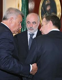 Президент ОАО "ЛУКойл" Вагит Алекперов (слева), председатель совета директоров ЗАО "Ренова" Виктор Вексельберг (в центре) и председатель совета директоров ОАО "Новолипецкий металлургический комбинат" Владимир Лисин (справа) перед началом встречи Президента России Дмитрия Медведева с чемпионами и призерами Игр XXIX Олимпиады в Пекине. Встреча прошла в Георгиевском зале Большого кремлевского дворца.