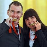 Олимпийский чемпион, гребец на каноэ Максим Опалев (слева) и олимпийская чемпионка по плаванью на открытой воде Лариса Ильченко (справа) на встрече Президента России Дмитрия Медведева с чемпионами и призерами XXIX летних Олимпийских Игр в Пекине. Встреча прошла в Георгиевском зале Большого Кремлевского дворца.