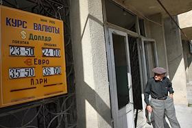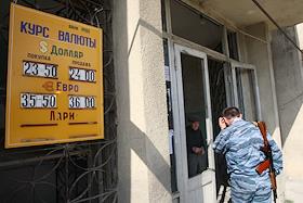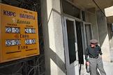 Сотрудник правоохранительных органов у входа в банк, где началась выдача денежной помощи населению города Цхинвала. Вывеска курса обмена валюты.