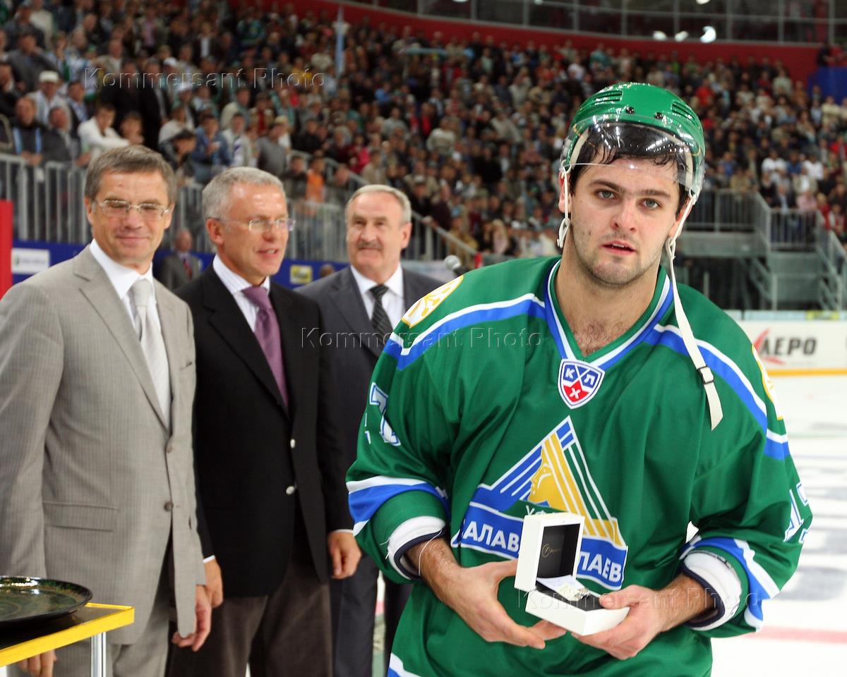 Чемпионат Континентальной хоккейной лиги (КХЛ) — Открытого чемпионата России. 1-й тур. Матч между командами "Салават Юлаев" (Уфа) и "Локомотив" (Ярославль) завершился со счетом 4 : 1 в пользу команды "Салават Юлаев". Генеральный директор ООО "Газэкспорт", президент Континентальной хоккейной лиги Александр Медведев (справа) вручил Кубок Открытия капитану "Салавата Юлаева" Владимиру Антипову (слева).