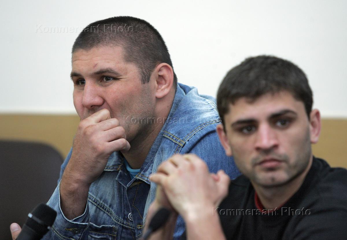Российские боксеры Магомед Абдусаламов и Хабиб Аллахвердиев (слева направо) на пресс-конференции, посвященной проведению боксерского шоу "Звезды ринга на Красной площади". Пресс-конференция прошла в Медиа-центре газеты "Известия".