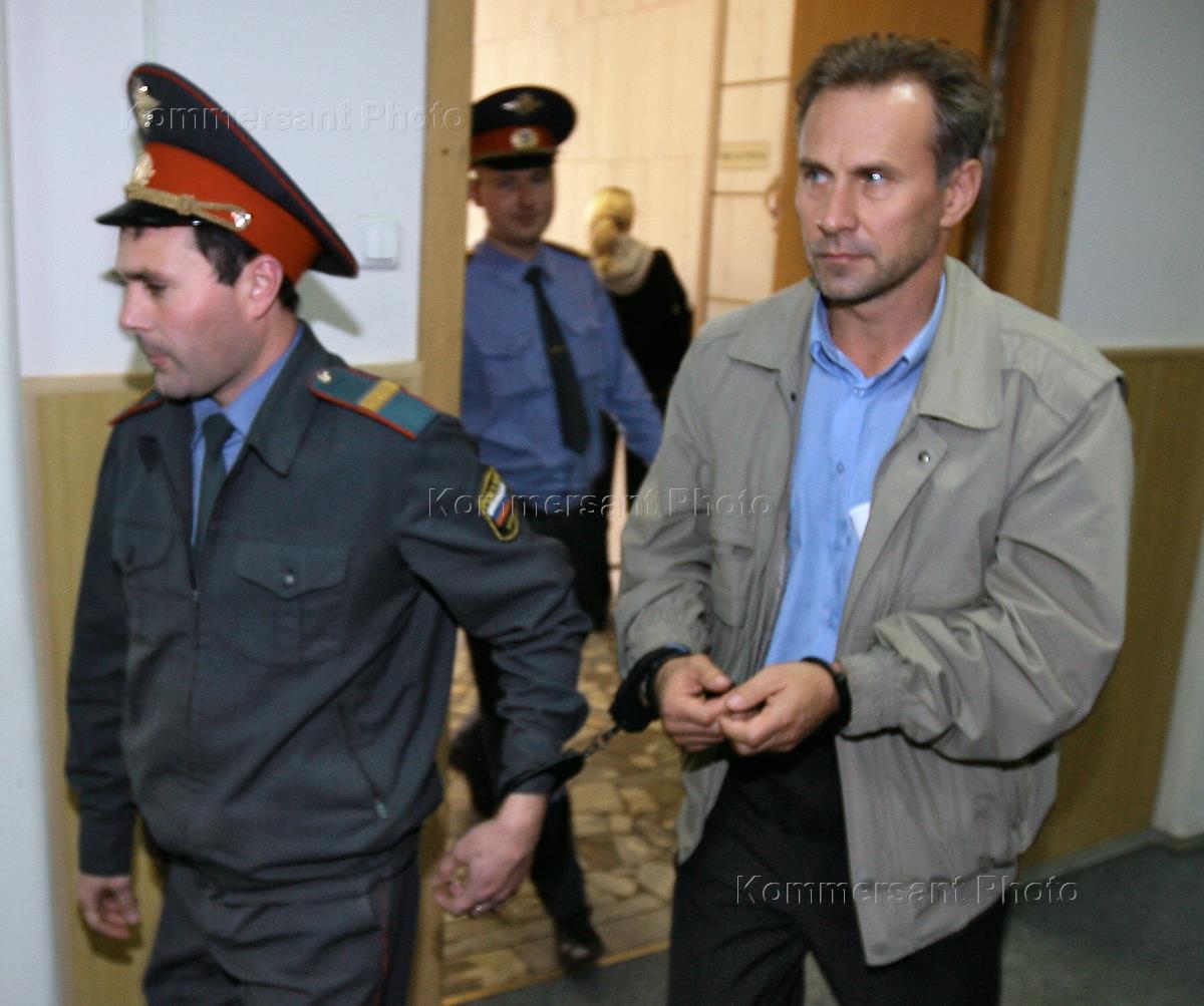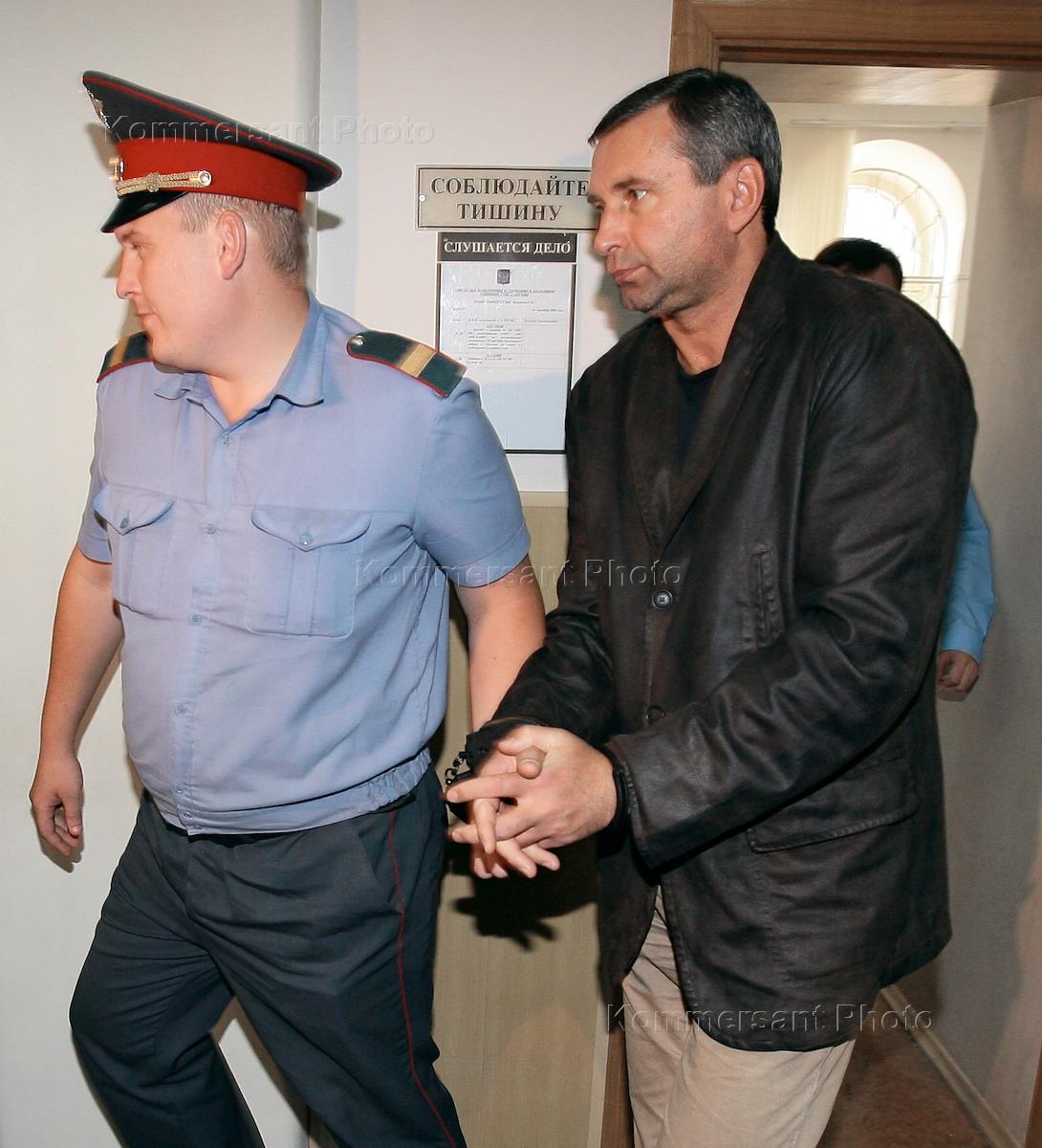 Заместитель начальника службы безопасности компании "Евросеть" Андрей Ермилов (справа), обвиняемый в похищении человека, вымогательстве и самоуправстве, на заседании Басманного суда. Басманный суд выдал санкцию на его арест.