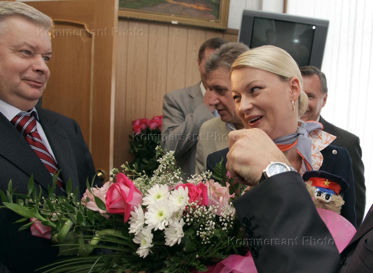 Торжественная выдача миллионного биометрического паспорта прошла в здании управления ФМС по Москве на улице Покровка. Директор Федеральной миграционной службы (ФМС) России Константин Ромодановский (слева) во время вручения паспорта его обладательнице, Светлане Кривошеевой (справа), работающей стюардессой в компании "Аэрофлот".
