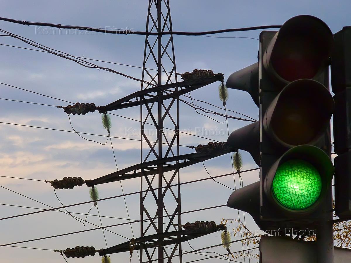 Жанровая фотография. Зеленый сигнал светофора на фоне опоры ЛЭП.