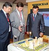 VII Международный инвестиционный форум "Сочи 2008". представитель от Краснодарского края в Совете Федерации (СФ) России Александр Починок (в центре) у стенда Чеченской республики.