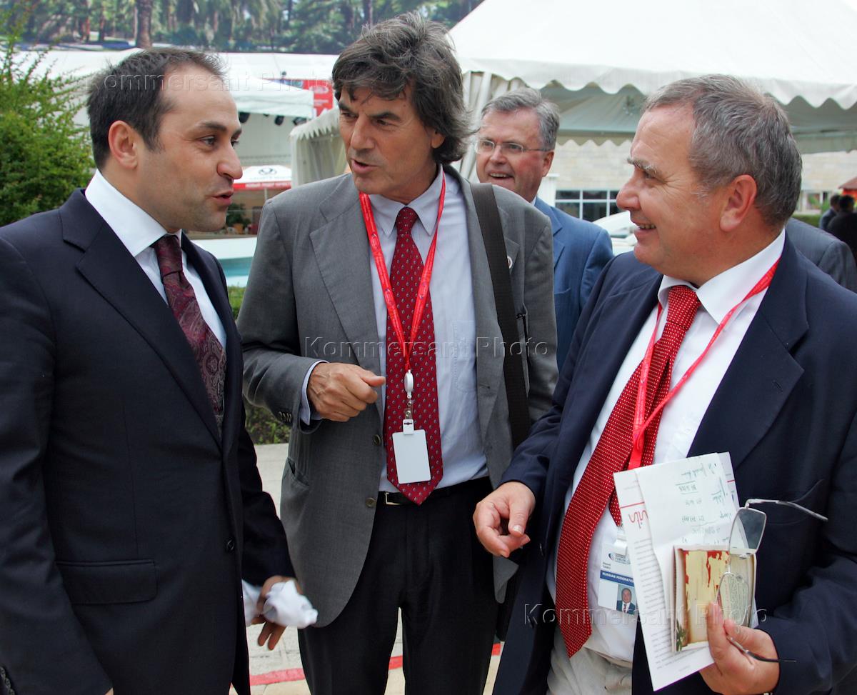 VII Международный инвестиционный форум "Сочи 2008". Слева направо: заместитель председателя комитета Государственной думы России по физической культуре и спорту Дмитрий Свищев, архитектор Вальтер Пихлер и глава банка UniCredit Banca Тео Диполи во время работы форума.