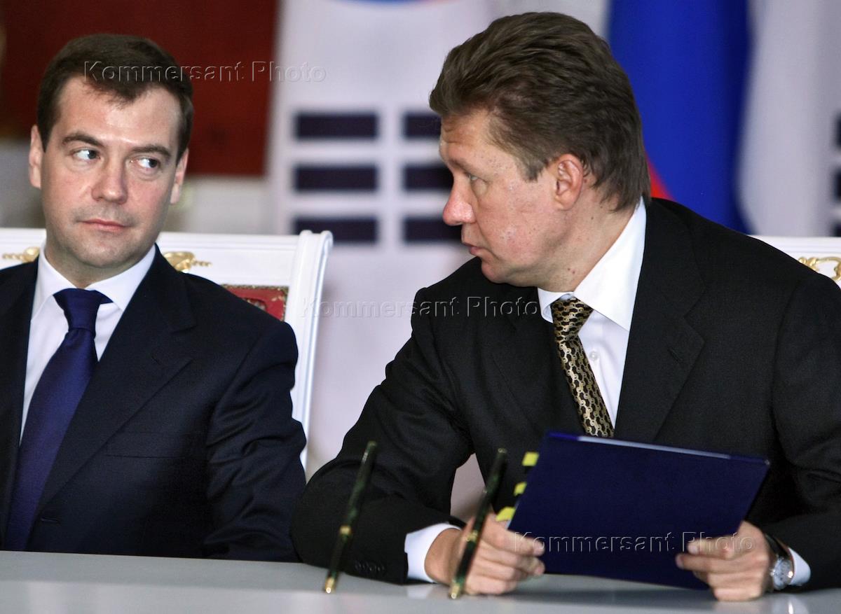 Russian First Deputy Prime Minister Dmitry Medvedev, left, Gazprom CEO Aleksey Miller at ceremony of signing of the memorandum of mutual understanding on deliveries of natural gas from Russia to Korea with company Kogas. Signing has taken place in the Kremlin.