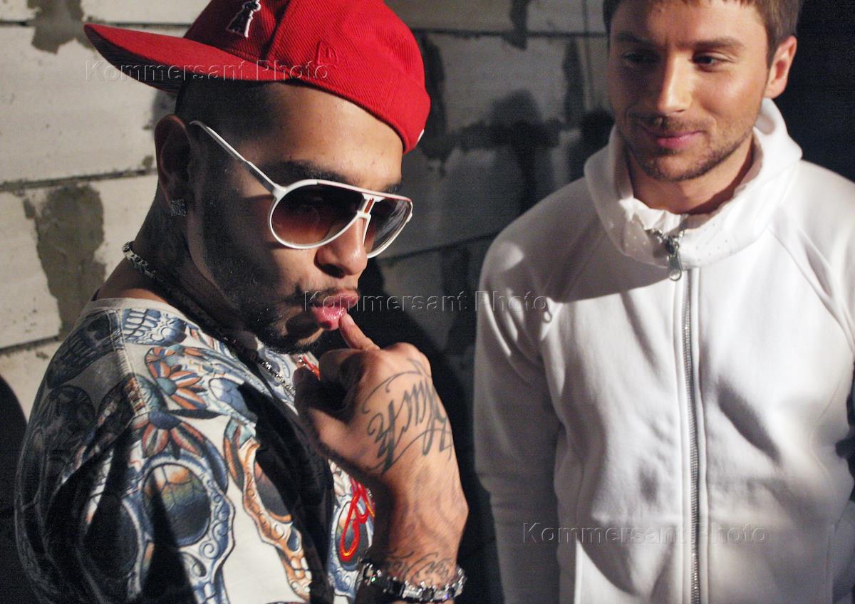 Певцы Тимати (слева) и Сергей Лазарев (справа) во время съемки нового видеоклипа.