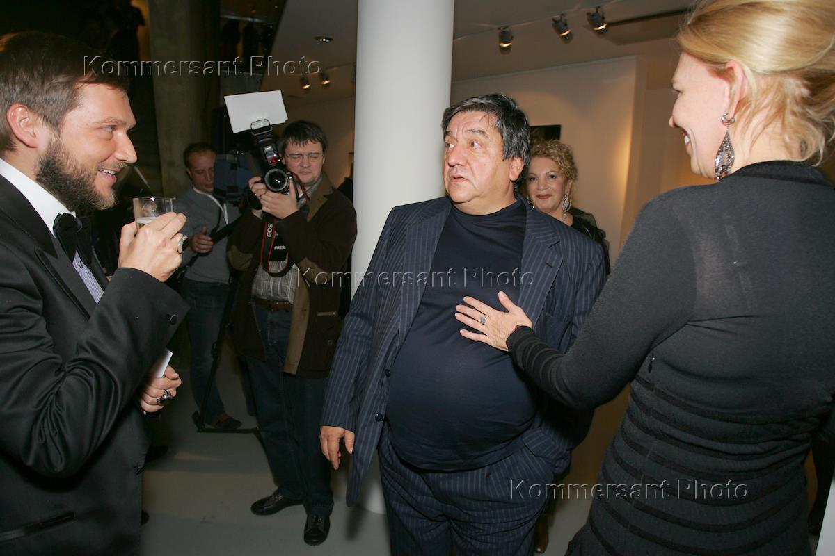 Ресторатор Анатолий Ляпидевский (в центре) на церемонии открытия персональной выставки художника Петра Аксенова "Золотая война" в галерее актуального искусства RuArts.