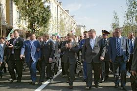 Президент Чеченской Республики Рамзан Кадыров (в центре) и полномочный представитель президента России в Южном федеральном округе Владимир Устинов (второй справа) во время празднования 420-й годовщины установления добрососедских отношений между народами России и Чечни. В честь годовщины проспект Победы города Грозный переименован в проспект имени В.В.Путина.