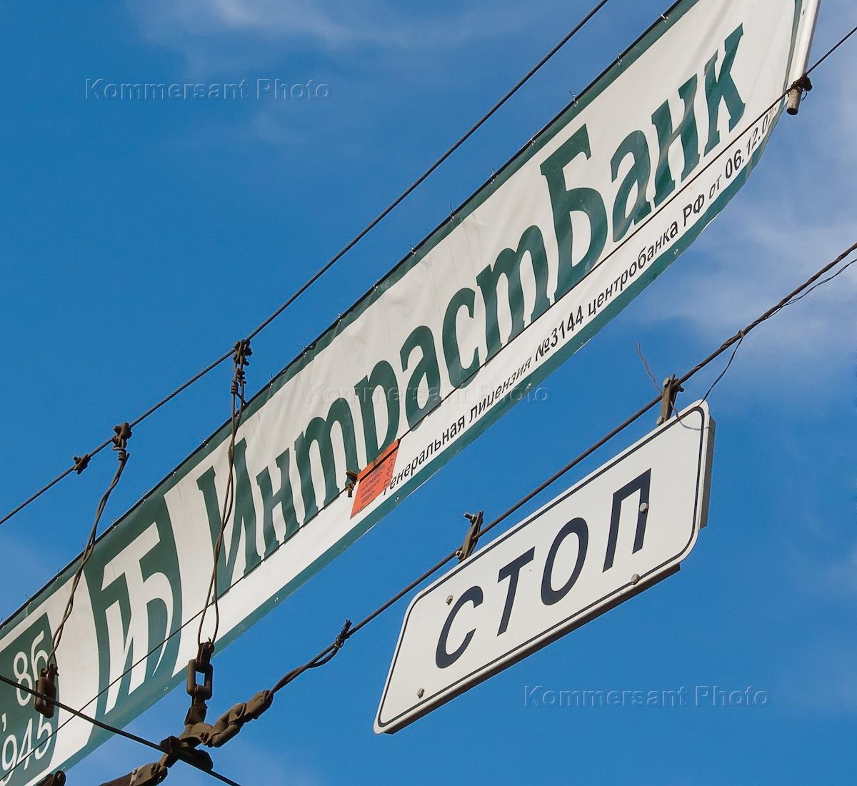 Табличка "Стоп" на фоне рекламной растяжки Интрастбанка на улице города.