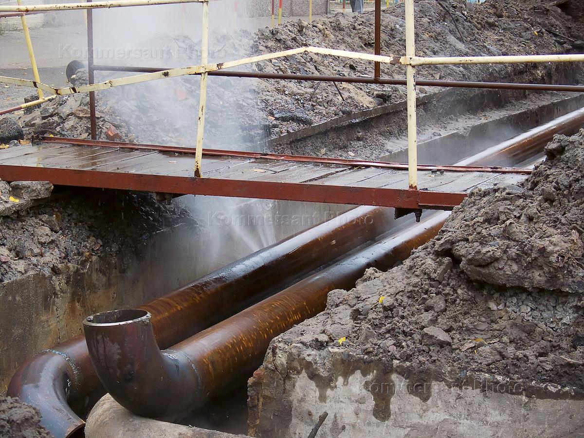 Авария на теплотрассе во дворе жилого дома. Фонтан горячей воды из пробитой трубы отопления.