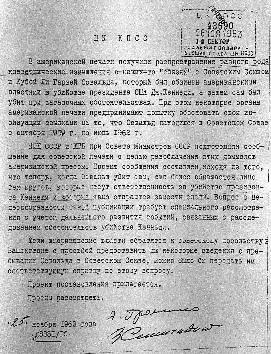 One of the formerly secret documents of the Communist Party Central Committe regarding the case of Lee Harvey Oswald and the assasination of American President John F. Kennedy was declassified this year by the Federal Security Service.