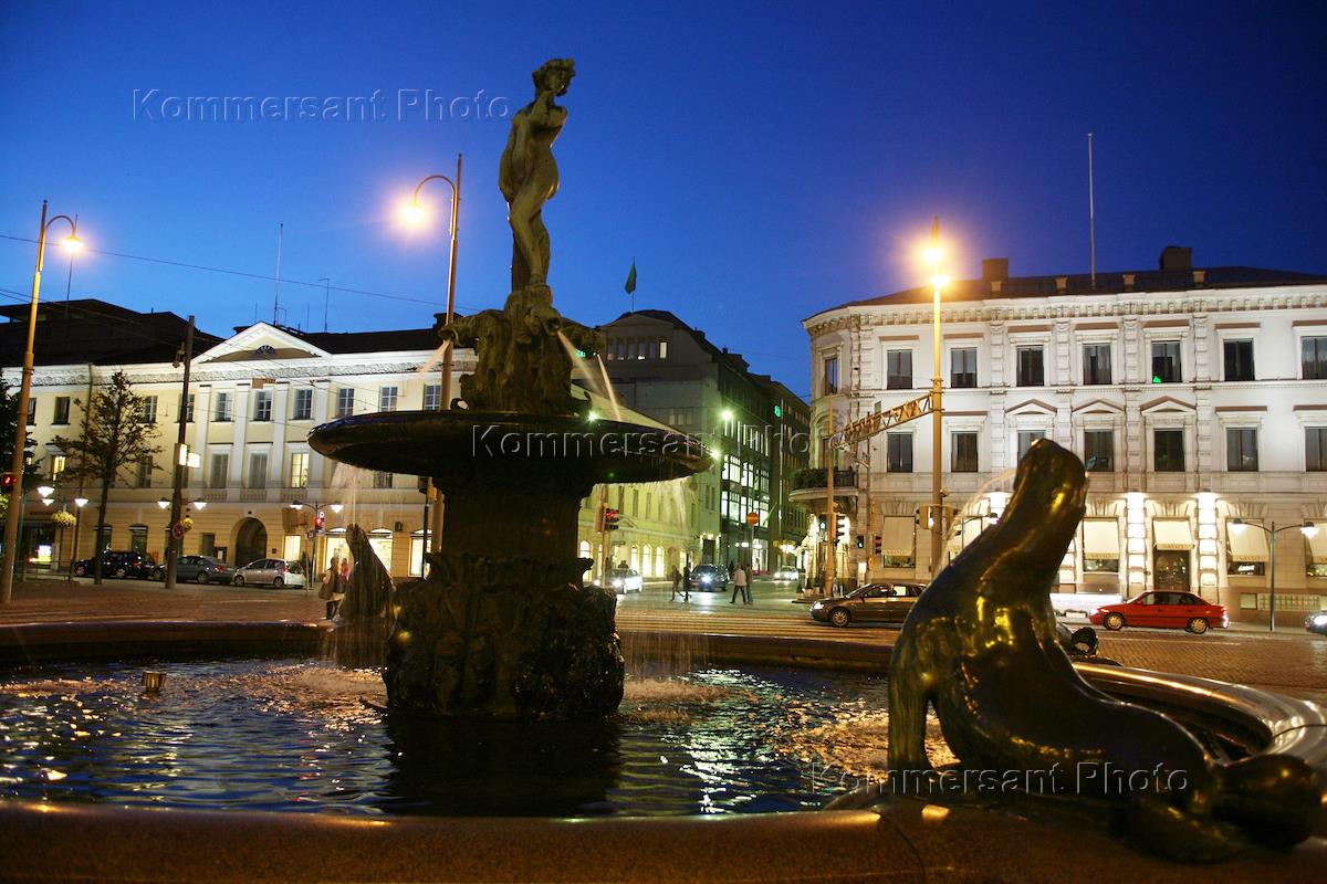Виды города Хельсинки. Фонтан на площади перед зданием Шведского посольства.