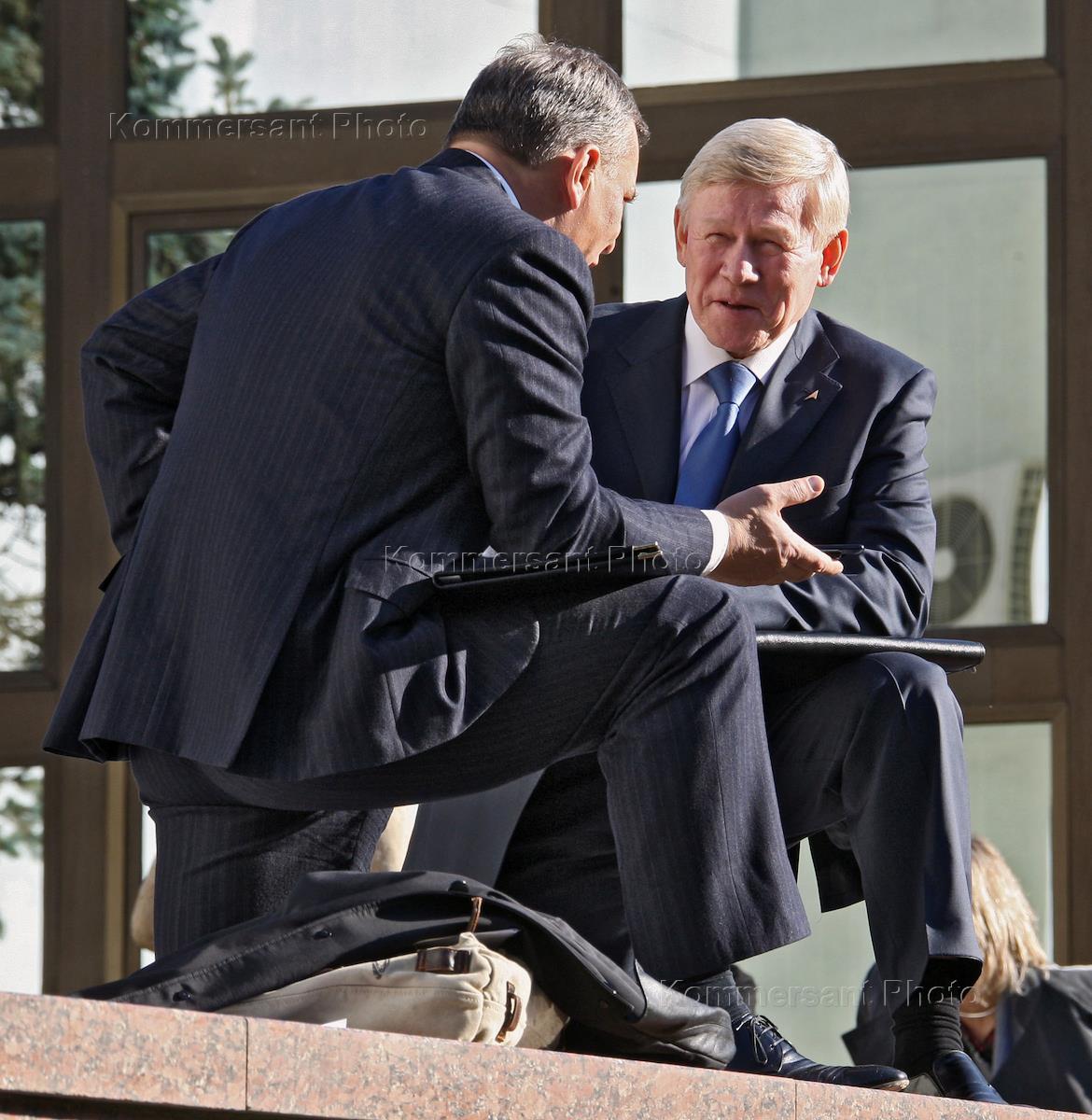 Глава Федерального космического агентства России Анатолий Перминов (справа) перед началом встречи председателя правительства России Владимира Путина и президента Белоруссии Александра Лукашенко.