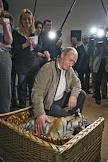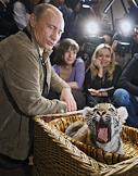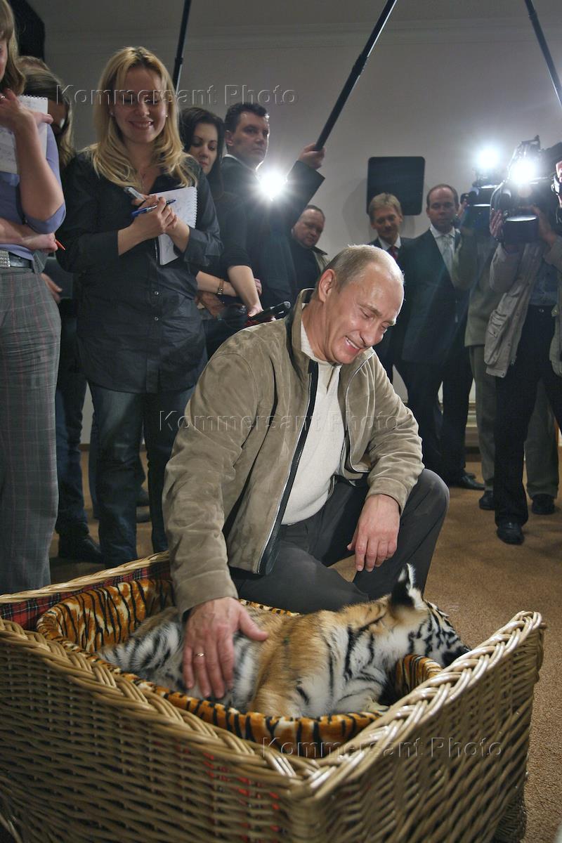 Председатель правительства России Владимир Путин (слева) получил в подарок в день своего рождения уссурийскую тигрицу. Тигренка показали журналистам. Корреспондент издательского дома "Коммерсантъ" Андрей Колесников (справа).