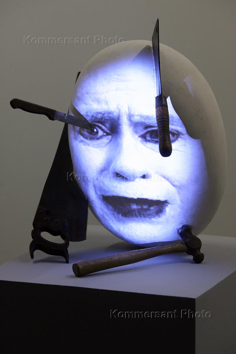 Американский медиа-художник Тони Оурслер представляет свою инсталляцию "Топор" на церемонии открытия выставки. Выставка открылась в залах Мультимедийного комплекса актуальных искусств в центре современного искусства "Винзавод".